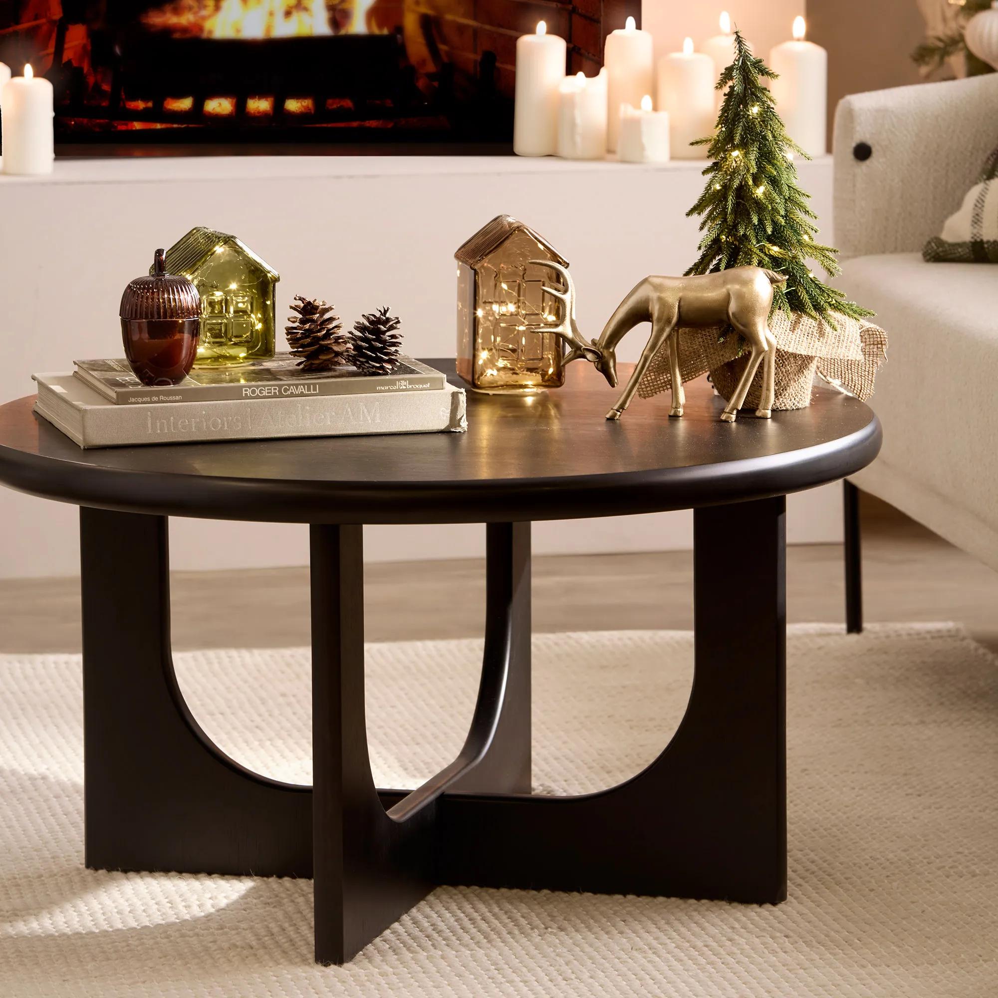 Sculptural curves meet a deep black finish in this statement coffee table. Its rounded top and artful base add serious design cred, perfect for anchoring your living space with presence and ease.